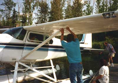 Mike launching a boat while Dan check out the plane