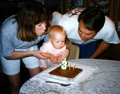 Megan helps Mom and Dad blow out the candles on their birthday cake.