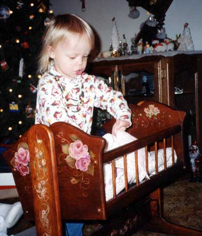 Megan playing with the new cradle Grandma painted.