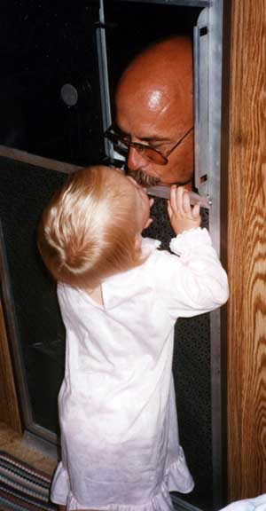 Megan kissing Grandpa through the screen door on the camper