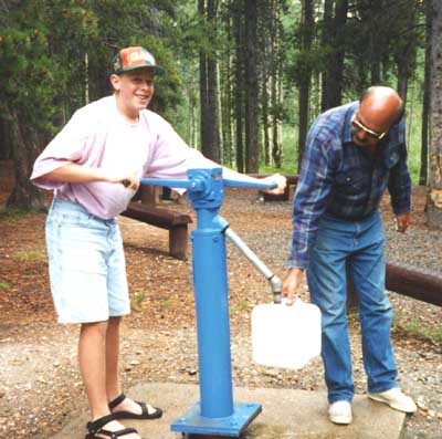 Dan helping Dad get some water, with a fun pump