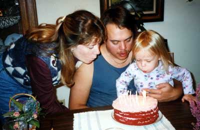 Megan helps Mom and Dad blow out the candles on their birthday cake.